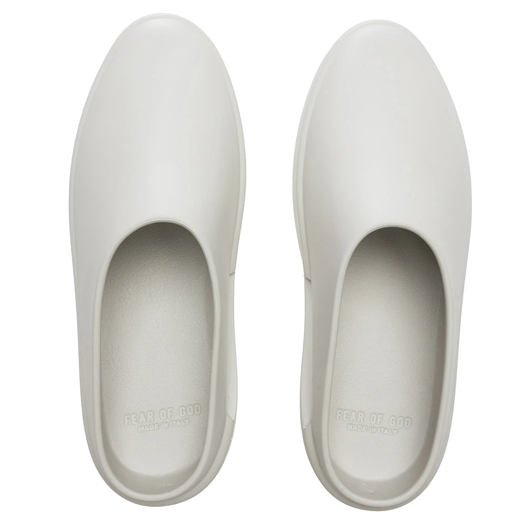 The Luxury Los Angeles-based label Fear of God introduces The California. Made entirely from innovative foam rubber produced in Italy from patented XL Extralight Technology. The Extrabounce compound is light and allows for greater flexibility, comfort, and durability. Backless and made for a slip-on design, the sculptural aesthetic emphasizes functionality by incorporating an inner vent to provide maximum airflow, while the raised tread provides optimal traction and durability. Fear of God branding at the heel ties together the sleek aesthetic.