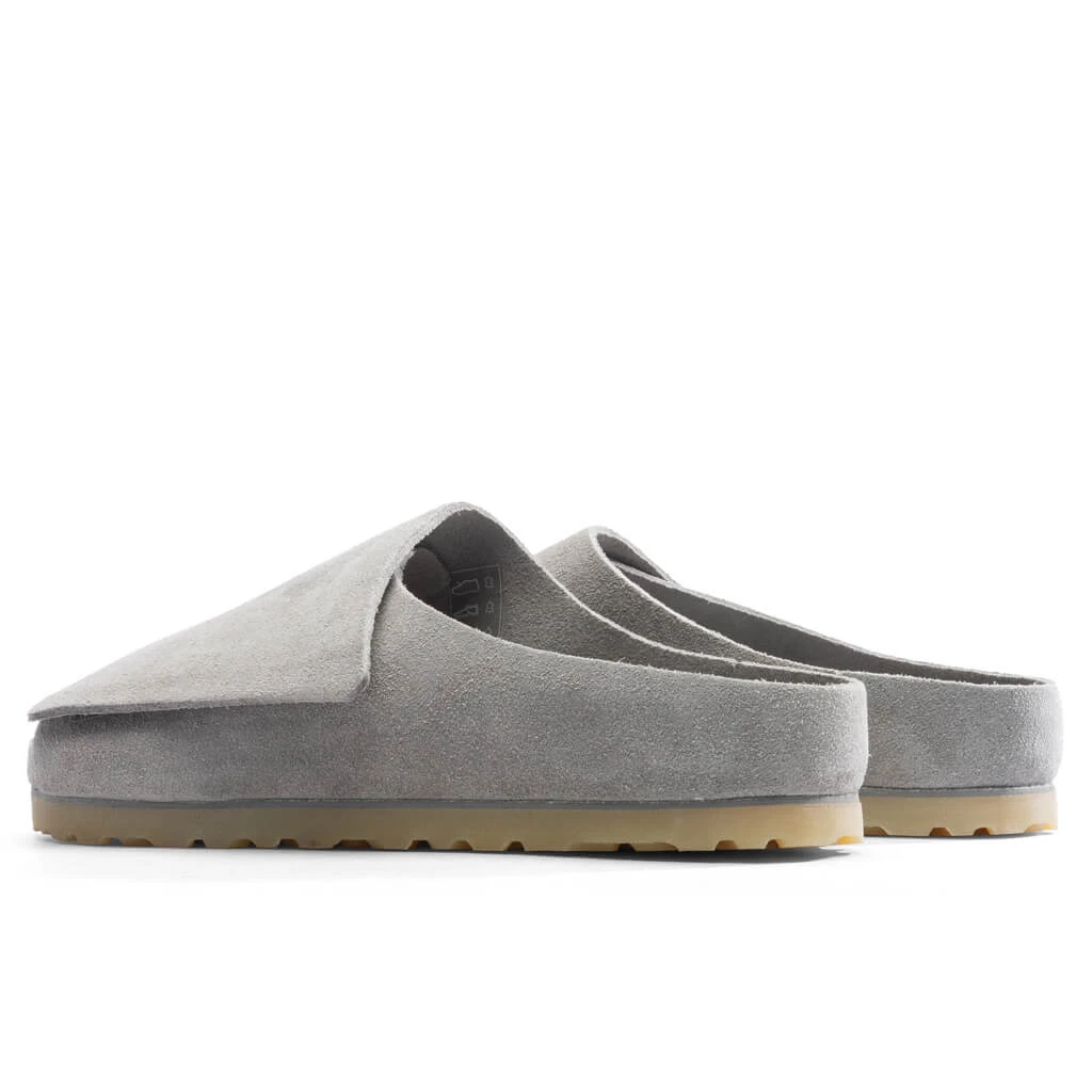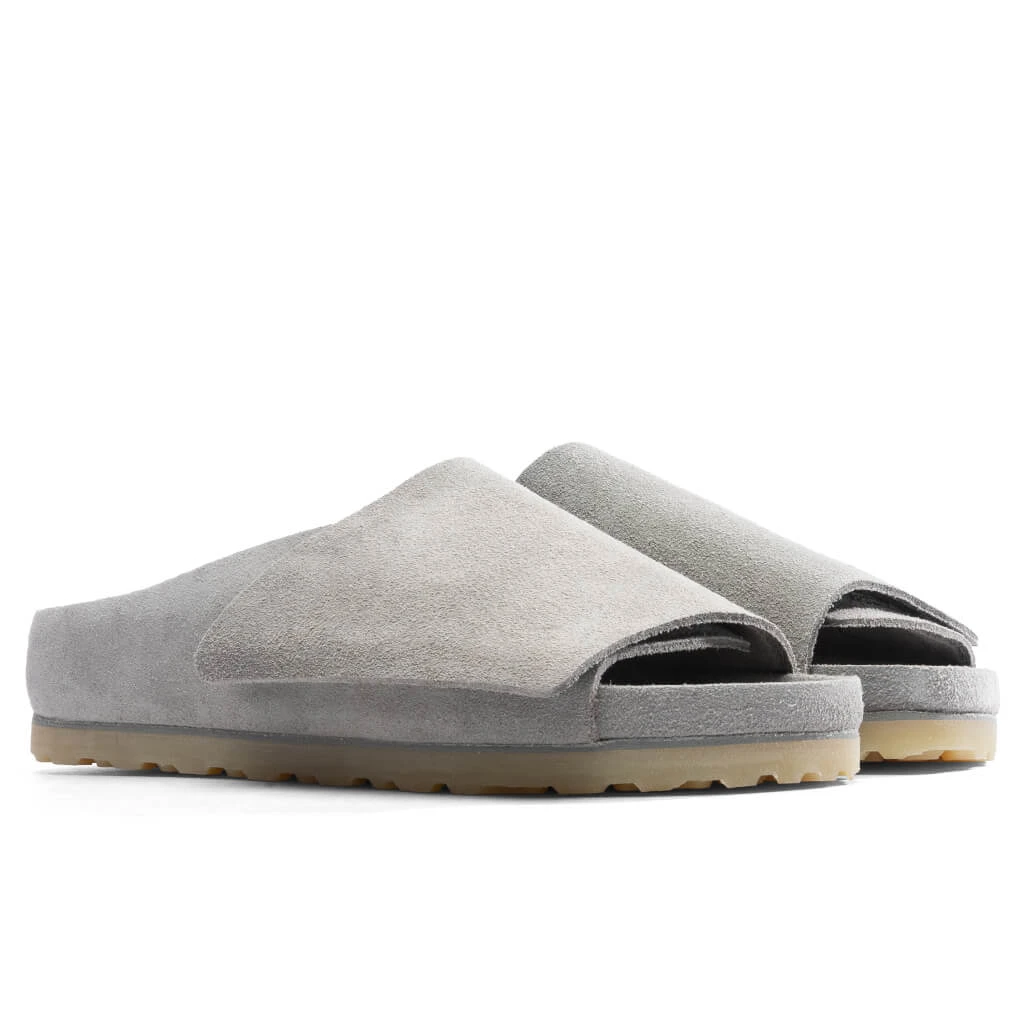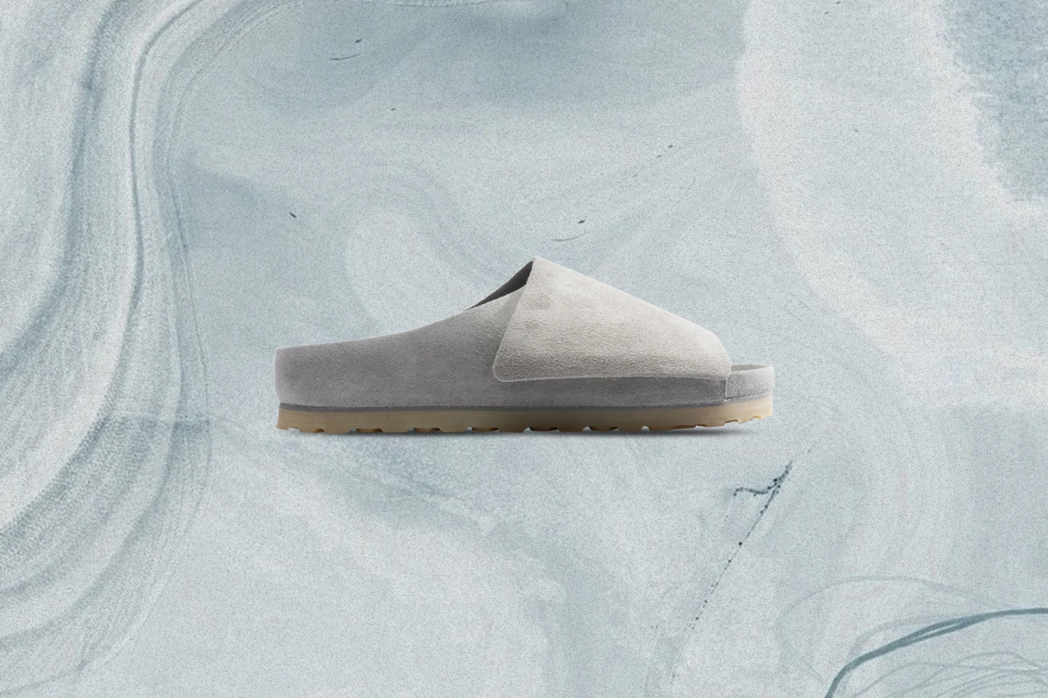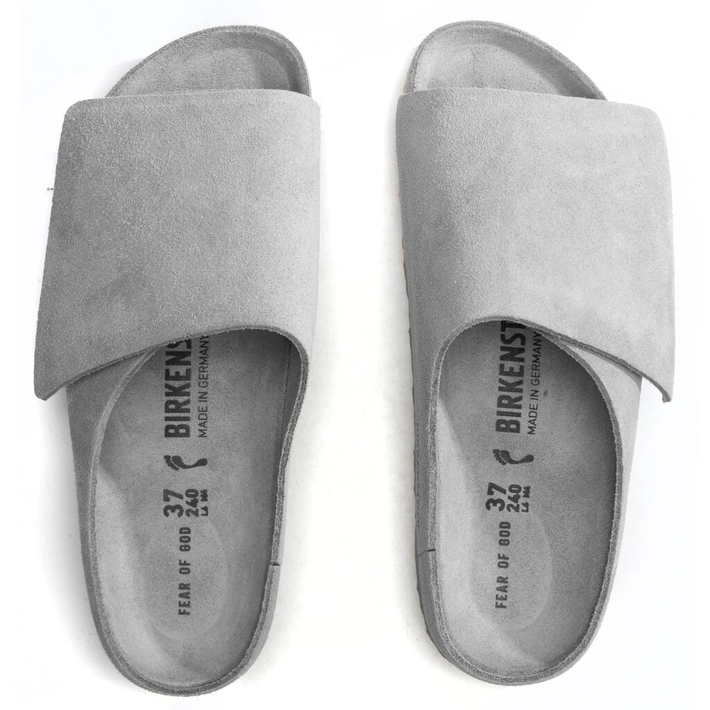 Fear of God and Birkenstock collide to introduce the Los Feliz. Honoring both heritage and Fear of God’s timeless design language, the sandal takes on an exaggerated, monolithic strap closure that accentuates the shoe’s minimal aesthetic. A blend of calf suede and wood felt takes up the upper. The tonal suede at the cork-latex footbed provides a comfortable touch. The collaborative branding at the insole paired with the translucent rubber outsole ties together the remainder of the footwear silhouette.