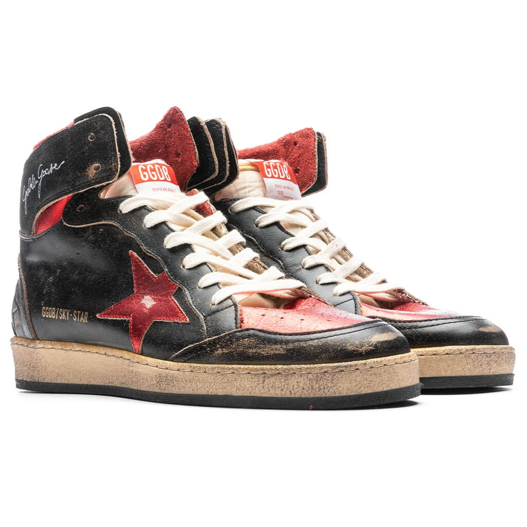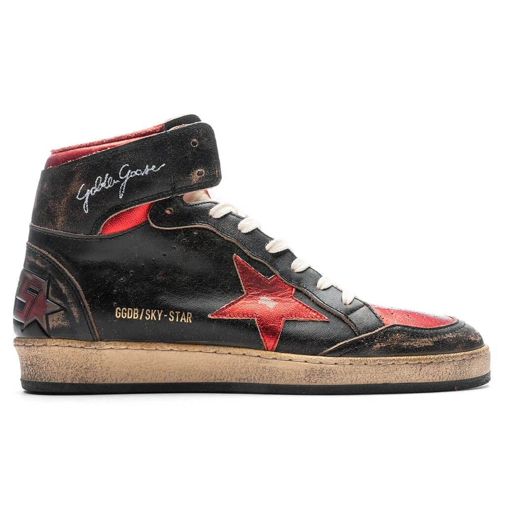 The Golden Goose Sky Star makes an impression with its premium aesthetic. The sneaker features a glossy leather upper and is treated with a distressed and worn-out effect. A metallic leather star and heel tab are placed, while signature branding is printed at the ankle. The nylon tongue and metallic leather toe provide additional dimension. The rubber outsole underneath supports the remainder of the look.