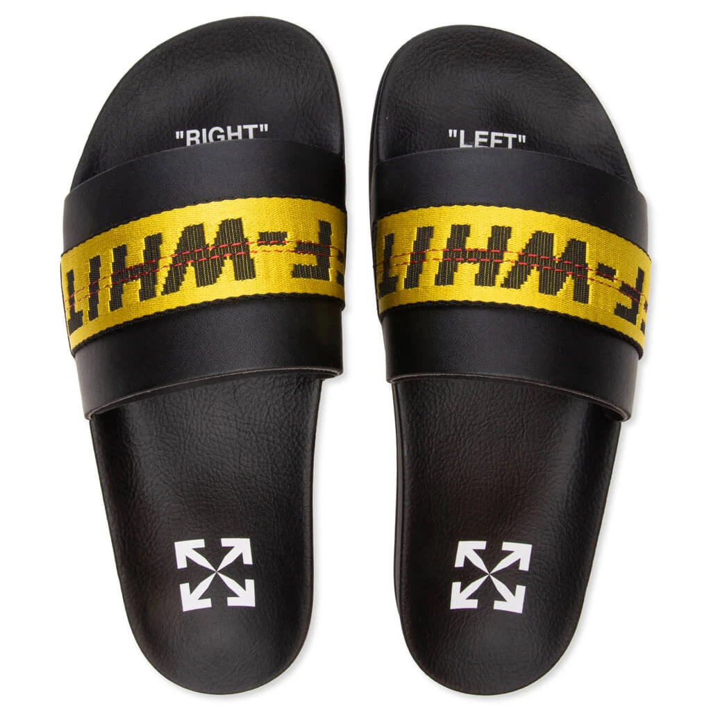 The Industrial Pool Slider from Off-White features an authentic and crisp construction. Composed of rubber within the upper, a signature yellow logo webbing band appears along with an open toeline and additional logo details. A rubber outsole ties together the design.