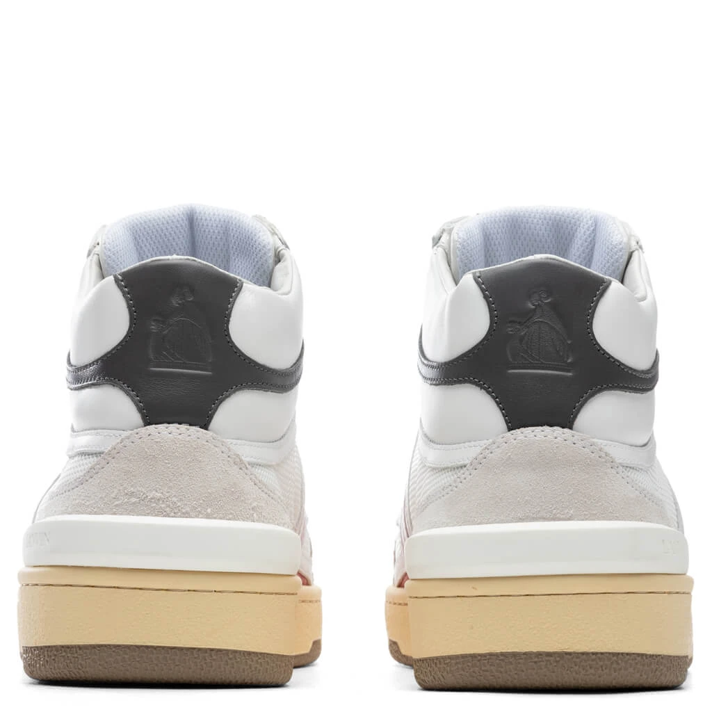 The Clay High Top Sneaker from Lanvin combines varying materials to provide an all-around high-quality sneaker, capable of comfort and extraneous wear. The upper is constructed with suede, mesh, and Nappa leather providing its timeless design and overlays. Signature âJLâ motifs are stitched upon the side panels while calfskin leather constructs the Lanvin logo. A rubber outsole protects its inner cushioning for long-lasting durability.