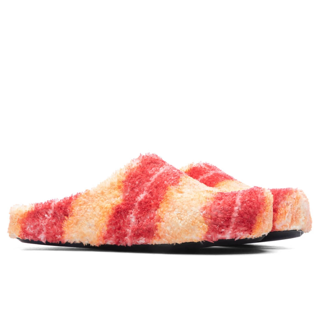 Marni’s contemporary aesthetics make a statement in the Fussbett Sabot. Taking on a striped terry cloth upper, the design’s anatomic inner sole is made up of leather. The ribbed rubber outsole underneath supports the rest of the design.