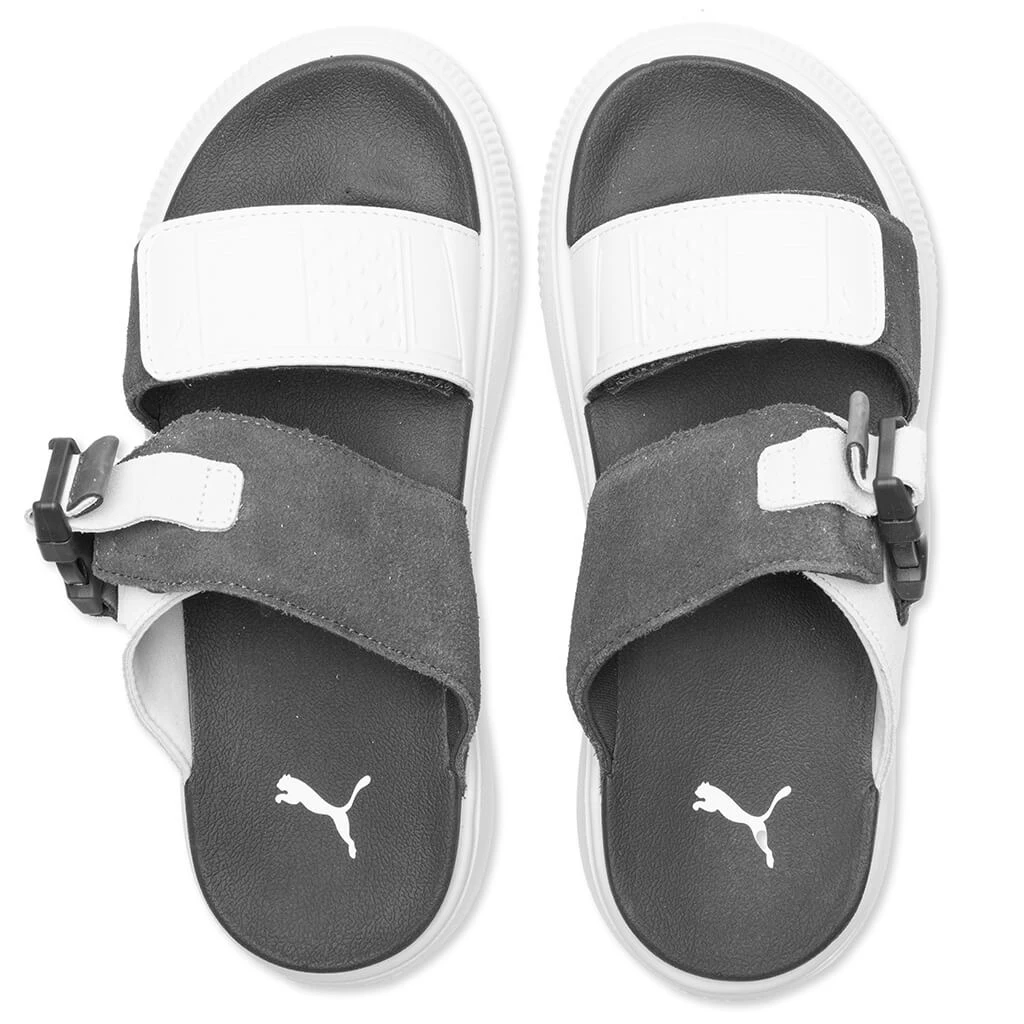 Incorporate a futuristic aesthetic with the Puma Suede Mayu Sandal Women’s. Composed of synthetic leather in the straps, the vamp strap features a hook-and-loop fastening and a Puma Cat logo. The second strap also features a TPU buckle, while the molded footbed displays screen-printed Puma branding as well. The IMEVA midsole and outsole provide additional comfort with each step. The slip-on silhouette is finished with a leather label and debossed Puma branding.
